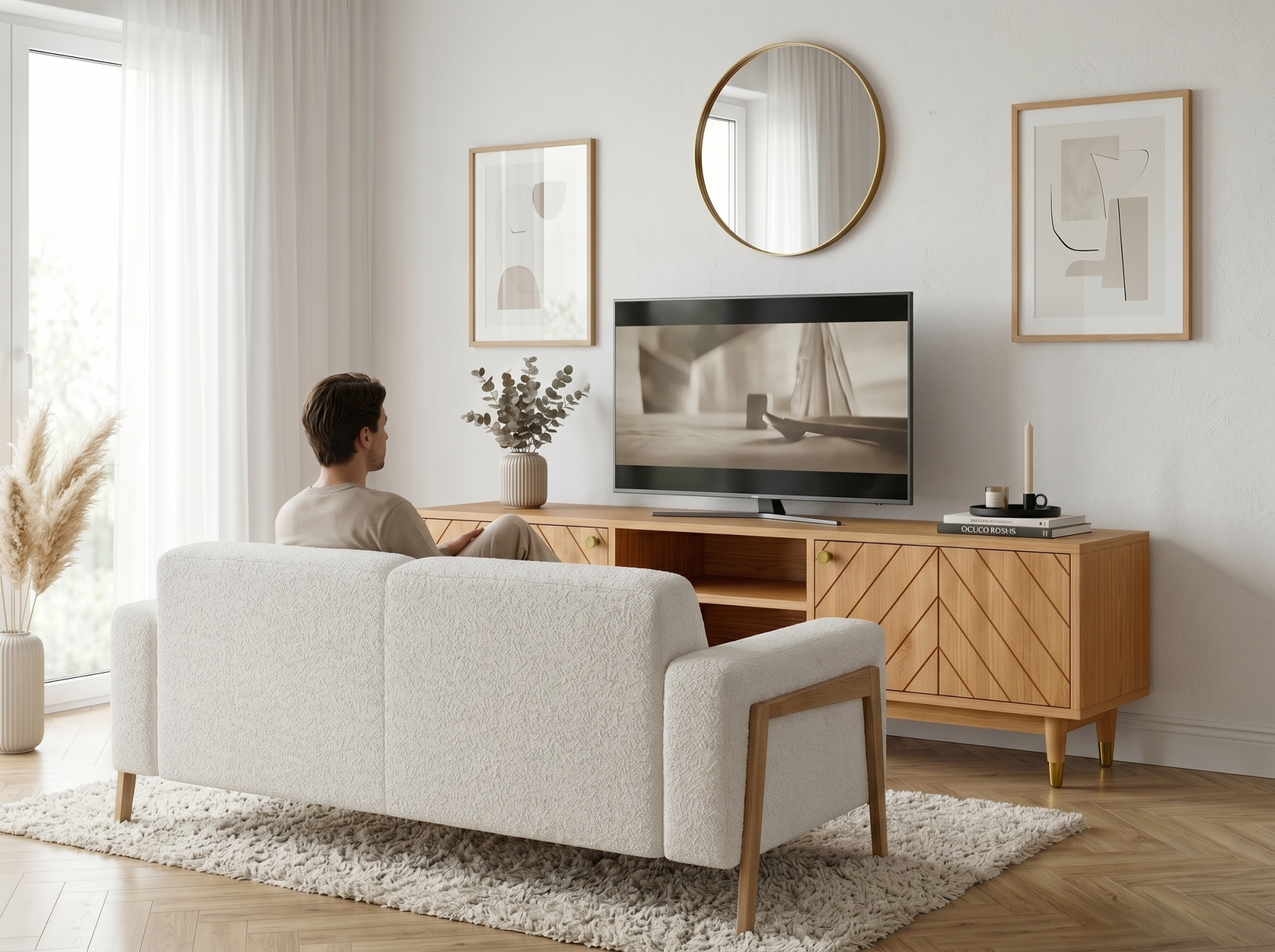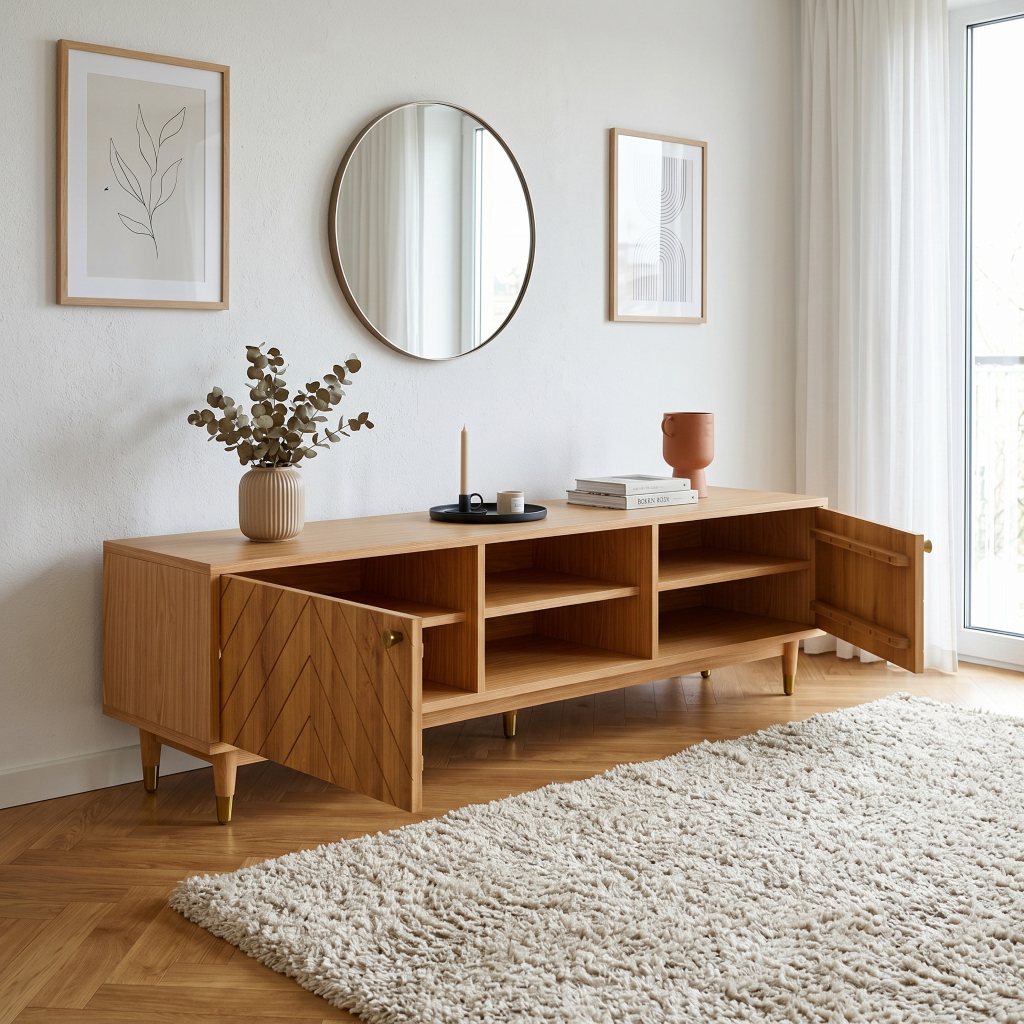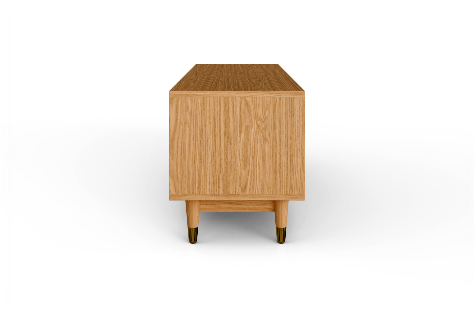 Suchen Sie eine elegante und praktische TV-Kommode aus Naturholz, die durch Design und Verarbeitungsqualität überzeugt? Die massive TV-Kommode Jessica mit einer Breite von 179 cm ist die ideale Wahl für das Wohnzimmer, wo ihr gefrästes Fischgrätmuster an den Türen sowie elegante goldfarbene Details besonders zur Geltung kommen. Die Fronten, Beine und Stützleiste sind aus massivem Eichenholz gefertigt, während das sichtbare Fach, die Oberplatte und die Seiten mit hochwertigem Furnier beschichtet sind. Dadurch erhalten Sie eine Eichen-TV-Kommode, die natürlichen Look, Stabilität und einen günstigeren Preis direkt vom Hersteller verbindet. Farbloser Öl-Wachs hebt zudem die Holzmaserung hervor und schützt die Oberfläche bei der täglichen Nutzung.