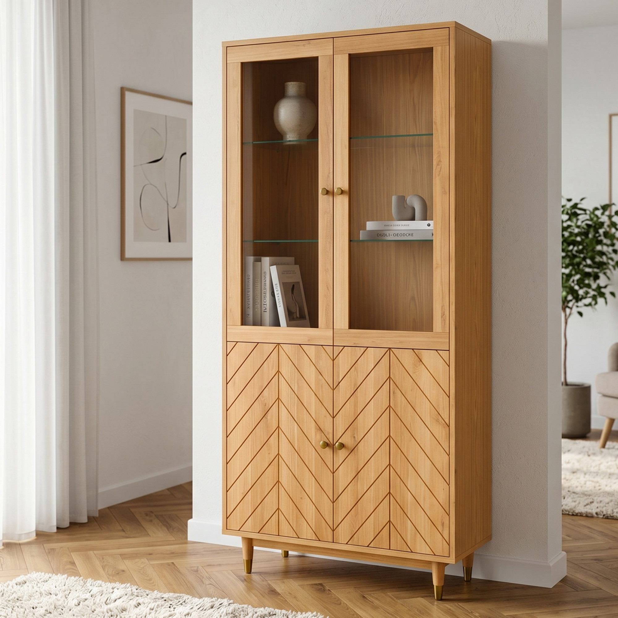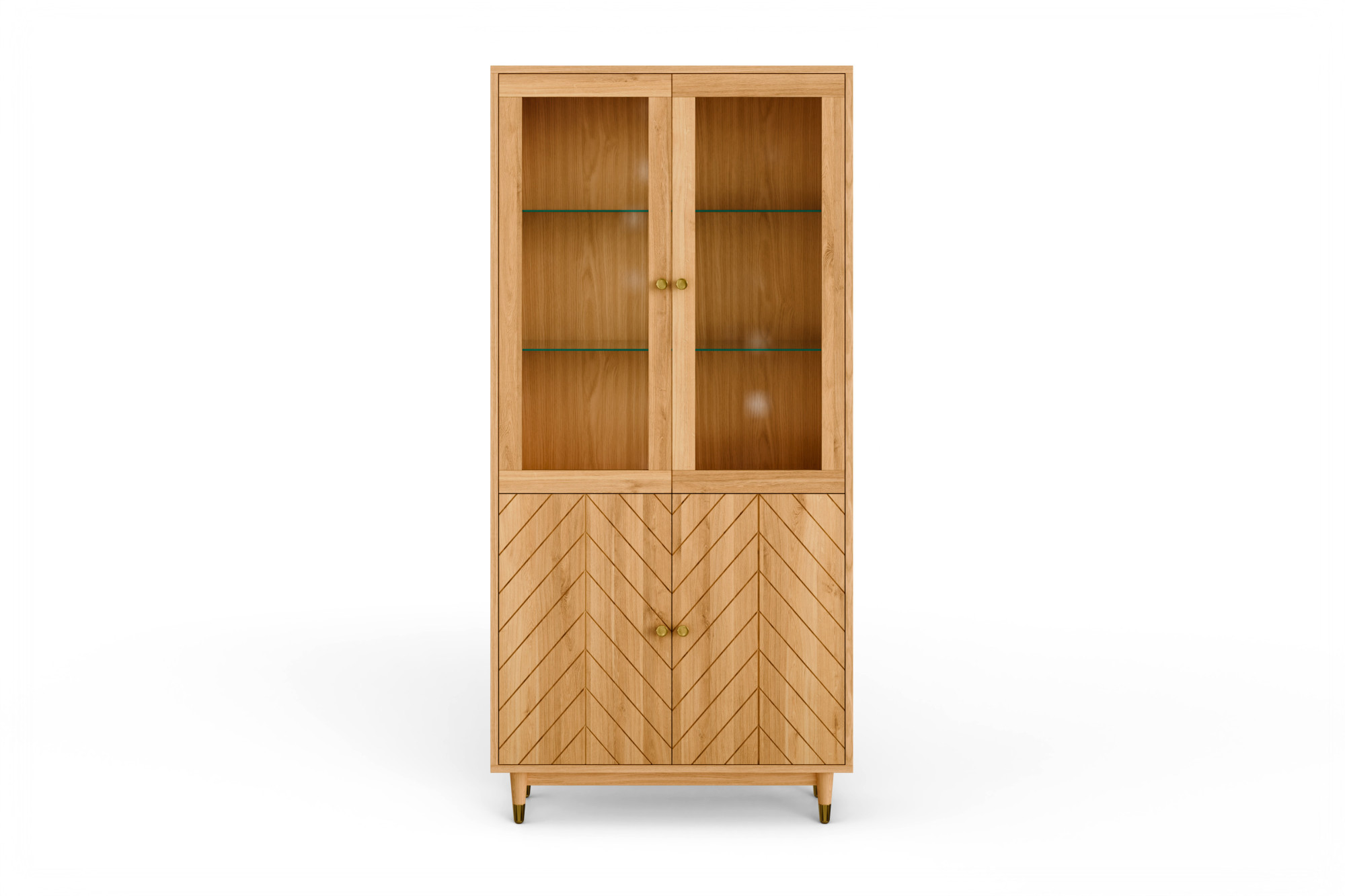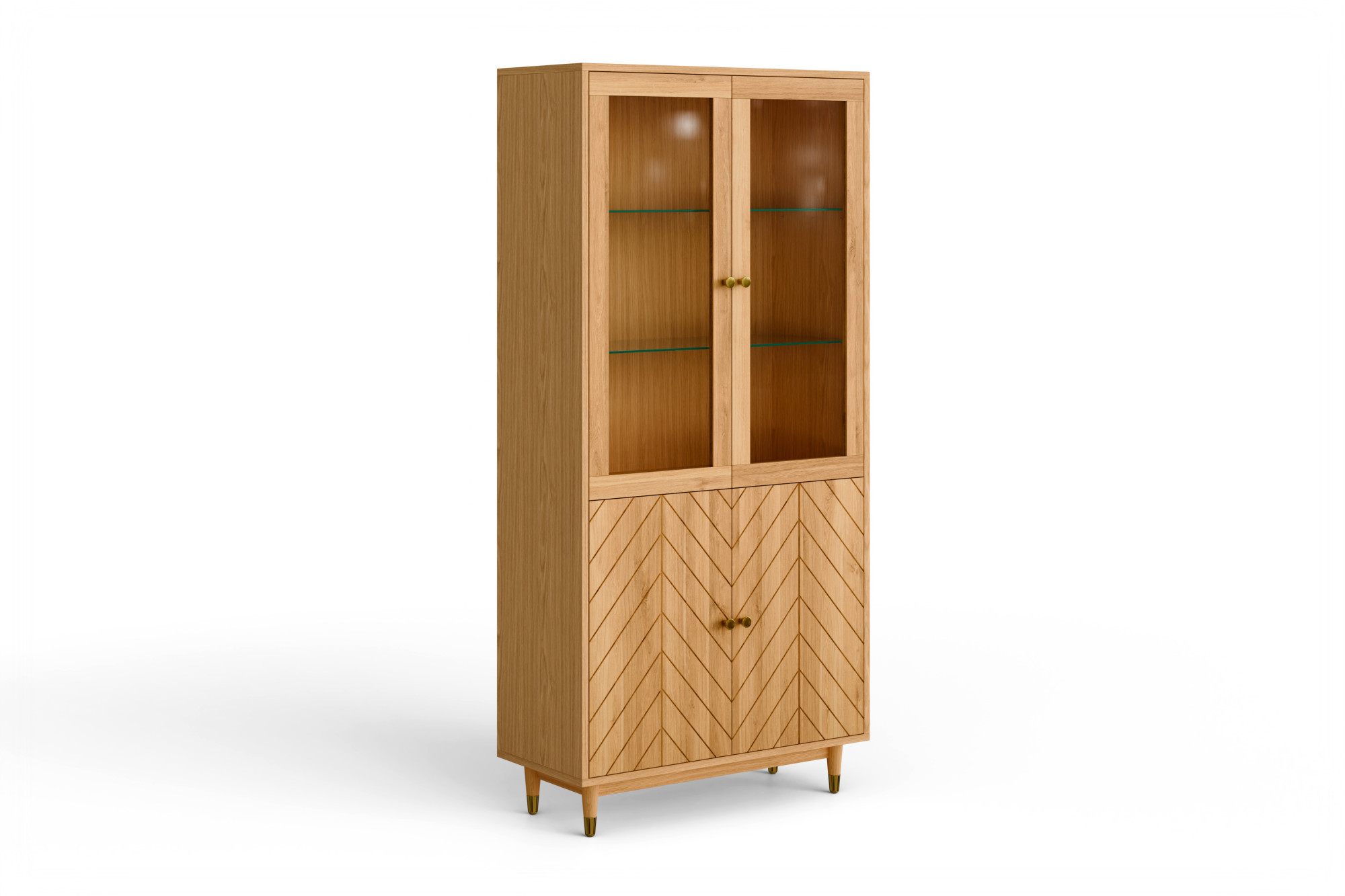 Der obere Teil der Vitrine bietet einen eleganten Platz zur Präsentation von Dekoration, Glas oder Porzellan, während die unteren Türen, verziert mit Fräsungen im Muster der Fischgrät, dem Möbelstück eine persönliche Note verleihen und zusätzlichen Stauraum verbergen. Innen befinden sich 2 Einlegeböden aus beschichteter Spanplatte und 2 Glasböden, die die Nutzung vielseitig gestalten. Praktische Details sind außerdem Messingknöpfe, goldfarbene Fußabschlüsse und Türscharniere mit Soft-Close-Funktion, die den Komfort im täglichen Gebrauch erhöhen.