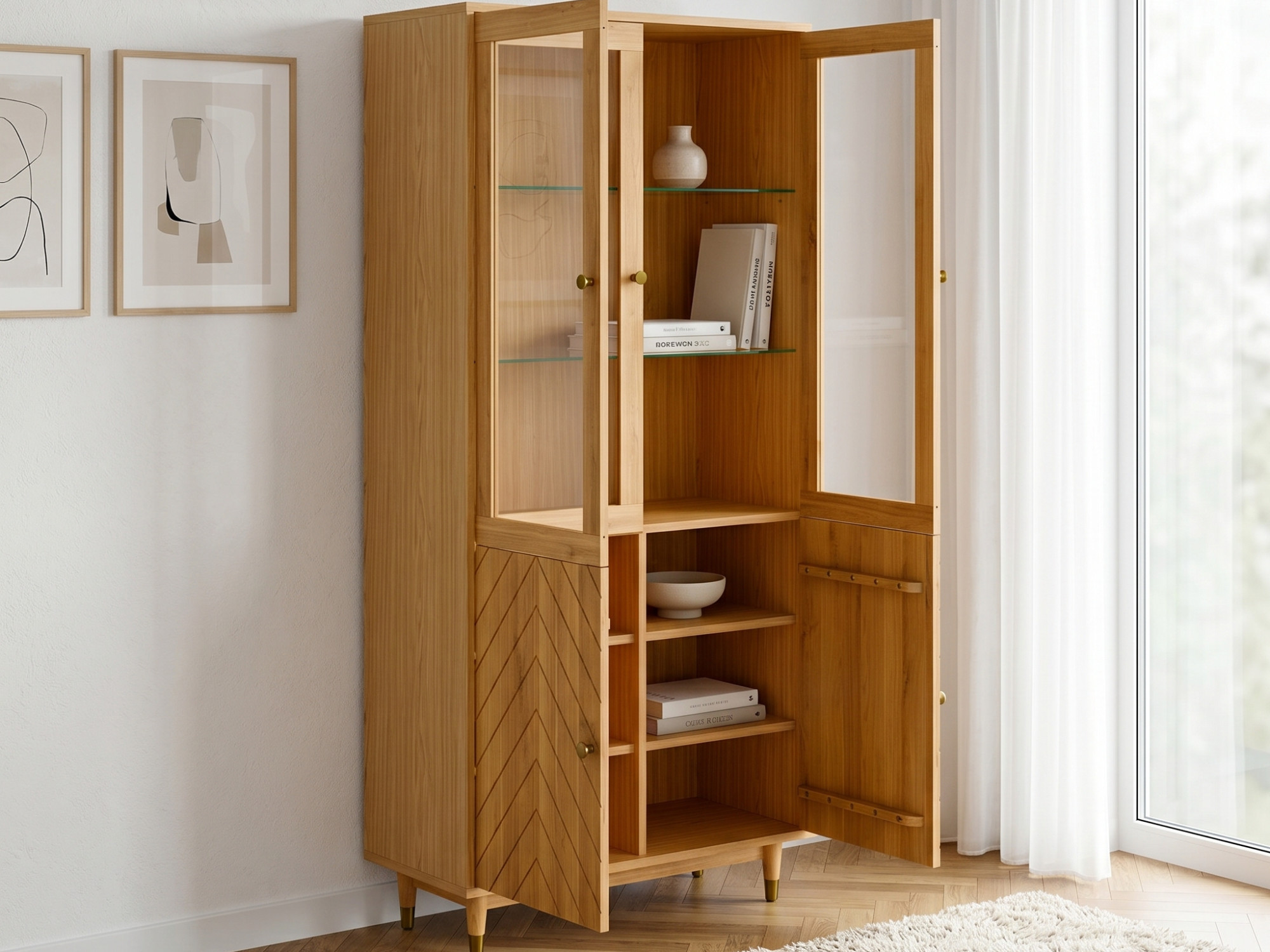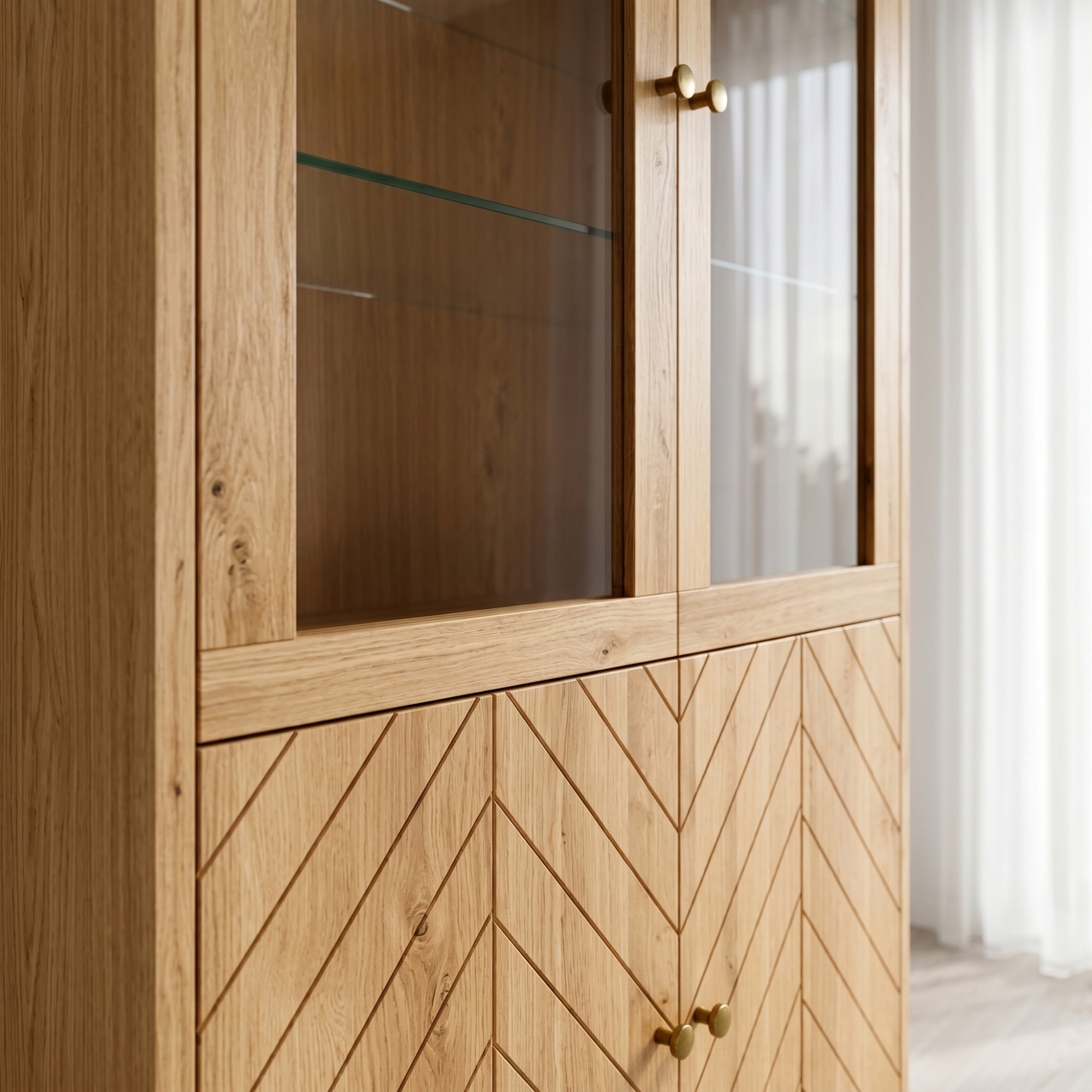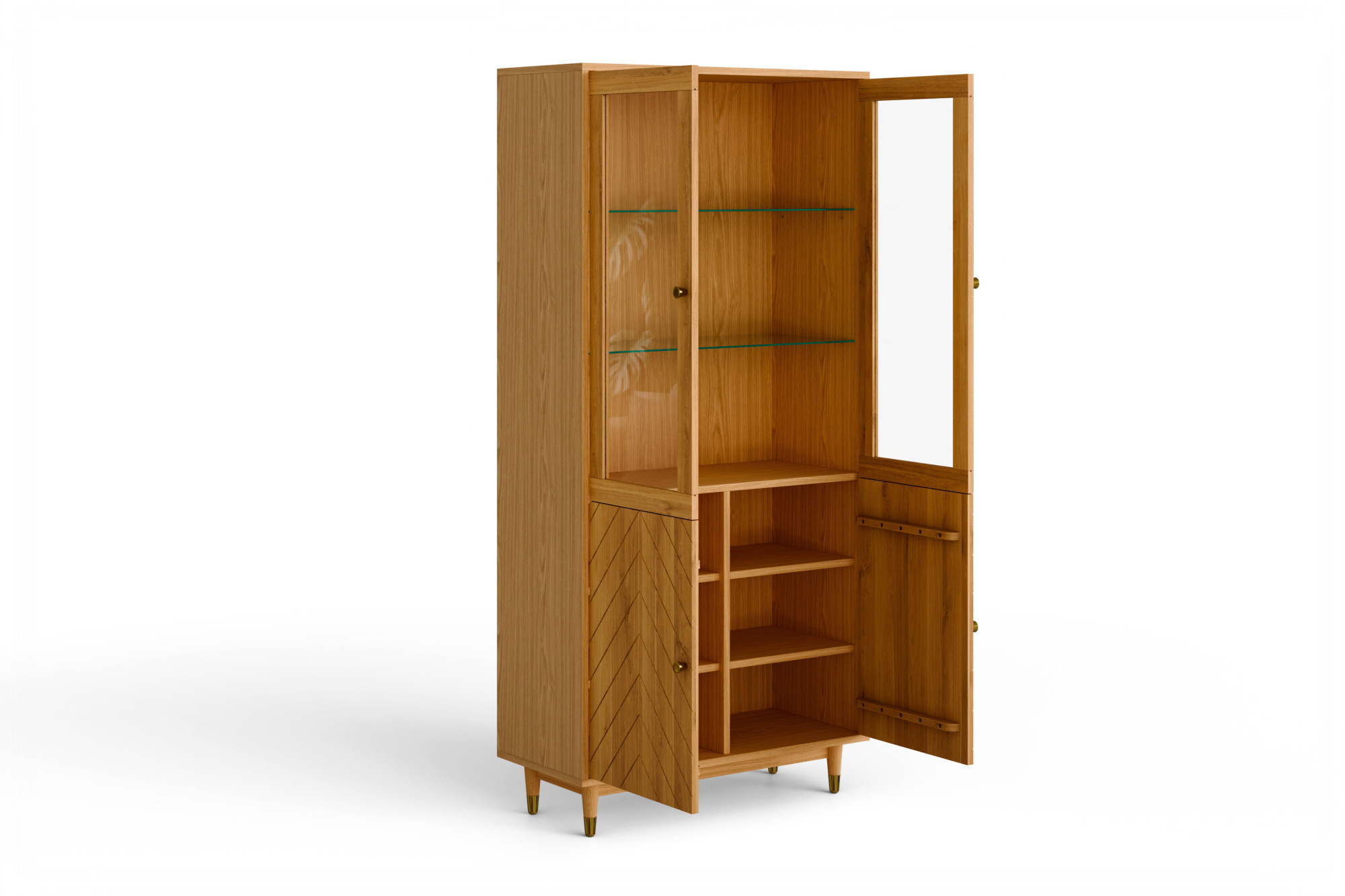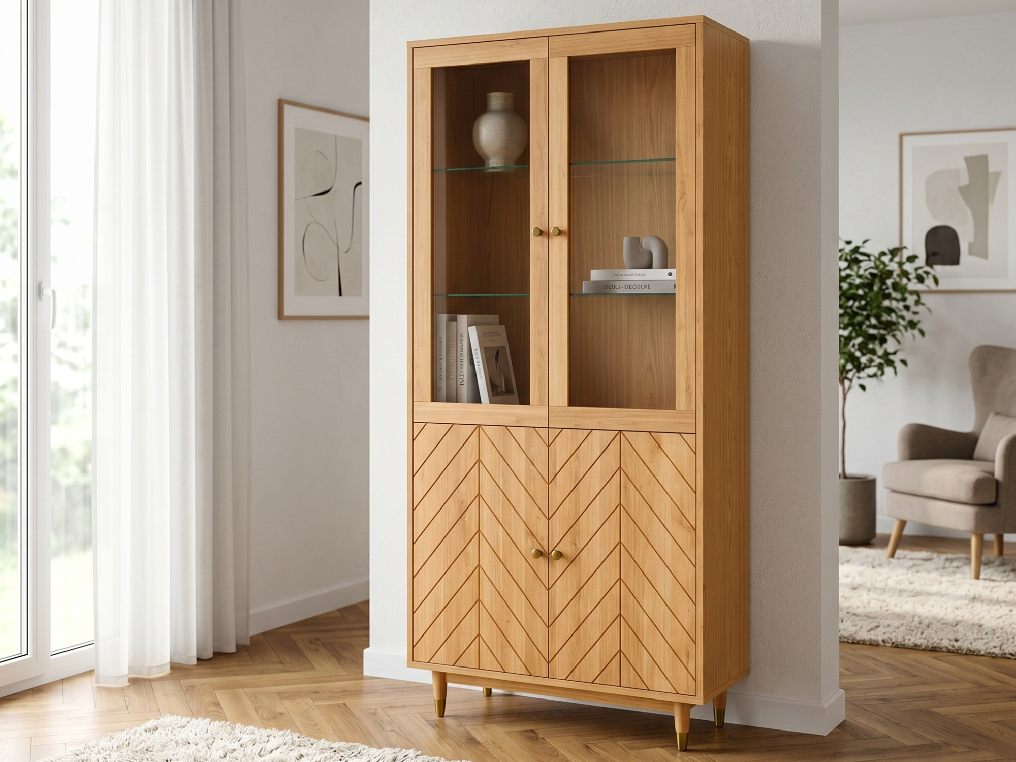 Der obere Teil der Vitrine bietet einen eleganten Platz zur Präsentation von Dekoration, Glas oder Porzellan, während die unteren Türen, verziert mit Fräsungen im Muster der Fischgrät, dem Möbelstück eine persönliche Note verleihen und zusätzlichen Stauraum verbergen. Innen befinden sich 2 Einlegeböden aus beschichteter Spanplatte und 2 Glasböden, die die Nutzung vielseitig gestalten. Praktische Details sind außerdem Messingknöpfe, goldfarbene Fußabschlüsse und Türscharniere mit Soft-Close-Funktion, die den Komfort im täglichen Gebrauch erhöhen.
